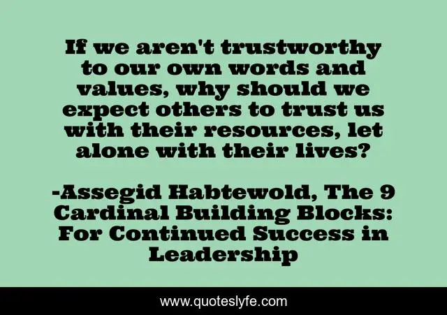 This page presents the quote "If we aren't trustworthy to our own words and values, why should we expect others to trust us with their resources, let alone with their lives?". Author of this quote is Assegid Habtewold, The 9 Cardinal Building Blocks: For Continued Success in Leadership. This quote is about trustworthy, trust, our-values, respecting-our-words,.