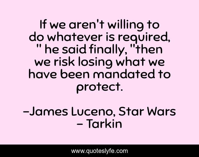 This page presents the quote "If we aren't willing to do whatever is required, " he said finally, "then we risk losing what we have been mandated to protect.". Author of this quote is James Luceno, Star Wars - Tarkin. This quote is about loss, anakin-skywalker, protection, risk, tarkin,.