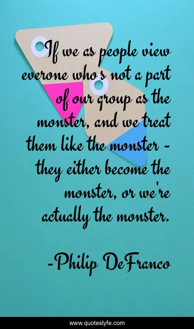 This page presents the quote "If we as people view everone who's not a part of our group as the monster, and we treat them like the monster - they either become the monster, or we're actually the monster.". Author of this quote is Philip DeFranco. .
