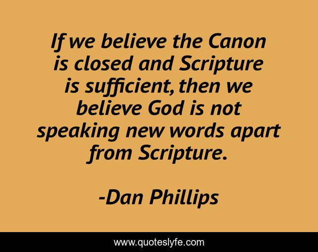 This page presents the quote "If we believe the Canon is closed and Scripture is sufficient, then we believe God is not speaking new words apart from Scripture.". Author of this quote is Dan Phillips. This quote is about bible, canon,.