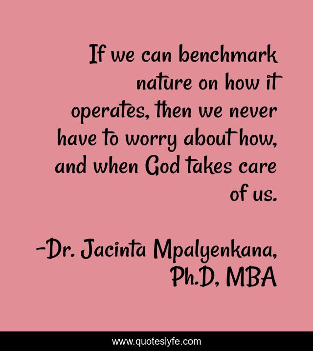 This page presents the quote "If we can benchmark nature on how it operates, then we never have to worry about how, and when God takes care of us.". Author of this quote is Dr. Jacinta Mpalyenkana, Ph.D, MBA. This quote is about surrender-to-god, life, life-lessons,.