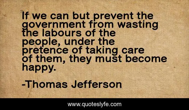 This page presents the quote "If we can but prevent the government from wasting the labours of the people, under the pretence of taking care of them, they must become happy.". Author of this quote is Thomas Jefferson. This quote is about happy, care, people,.