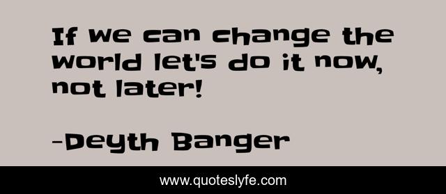 This page presents the quote "If we can change the world let's do it now, not later!". Author of this quote is Deyth Banger. This quote is about no-later, chance, now, change,.