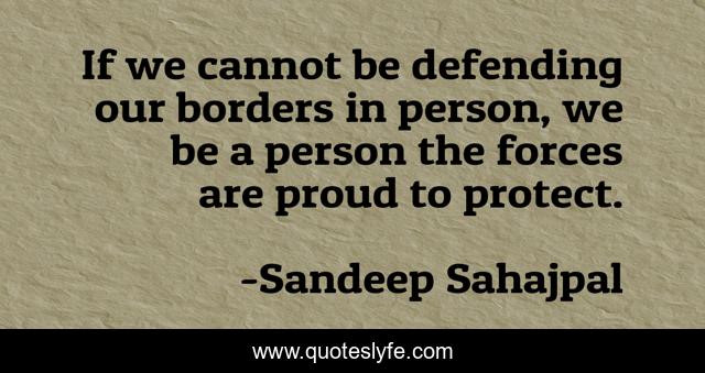 This page presents the quote "If we cannot be defending our borders in person, we be a person the forces are proud to protect.". Author of this quote is Sandeep Sahajpal. .