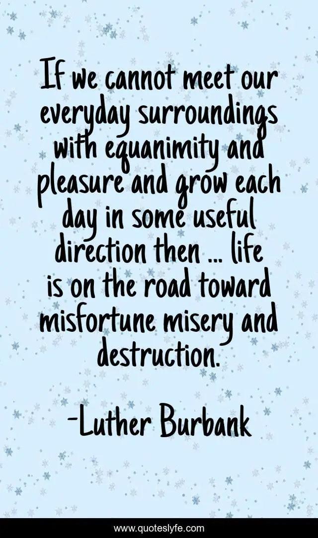 This page presents the quote "If we cannot meet our everyday surroundings with equanimity and pleasure and grow each day in some useful direction then ... life is on the road toward misfortune misery and destruction.". Author of this quote is Luther Burbank. This quote is about day, one,.