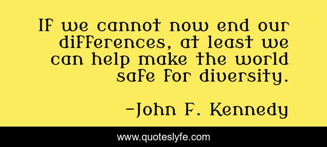This page presents the quote "If we cannot now end our differences, at least we can help make the world safe for diversity.". Author of this quote is John F. Kennedy. This quote is about world, diversity, help,.