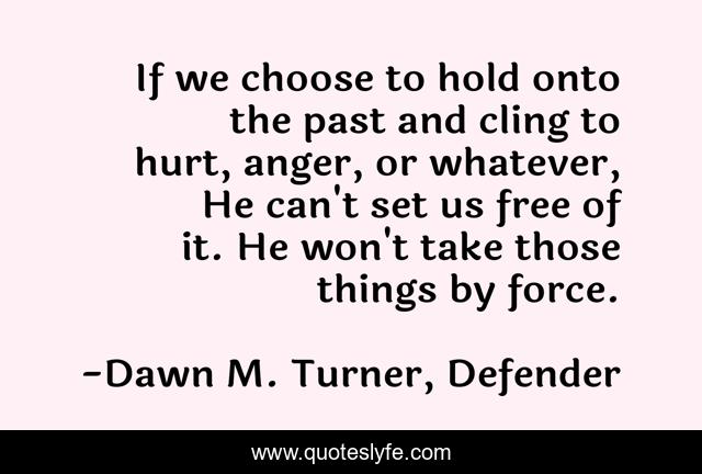 This page presents the quote "If we choose to hold onto the past and cling to hurt, anger, or whatever, He can't set us free of it. He won't take those things by force.". Author of this quote is Dawn M. Turner, Defender. This quote is about christian-romance, forgiveness, christian-fiction,.
