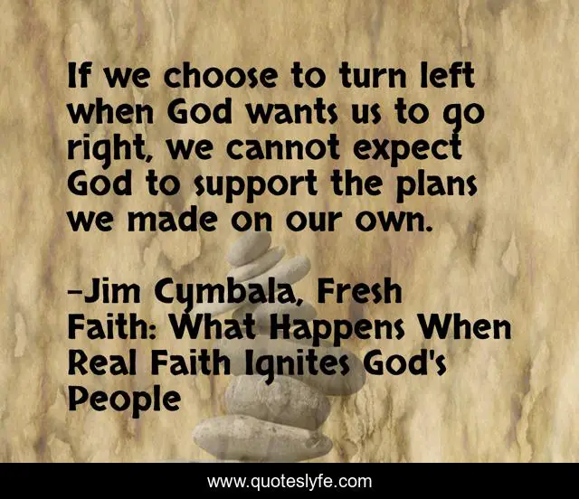 This page presents the quote "If we choose to turn left when God wants us to go right, we cannot expect God to support the plans we made on our own.". Author of this quote is Jim Cymbala, Fresh Faith: What Happens When Real Faith Ignites God's People. .