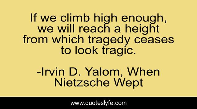 This page presents the quote "If we climb high enough, we will reach a height from which tragedy ceases to look tragic.". Author of this quote is Irvin D. Yalom, When Nietzsche Wept. This quote is about perspective, tragedy,.