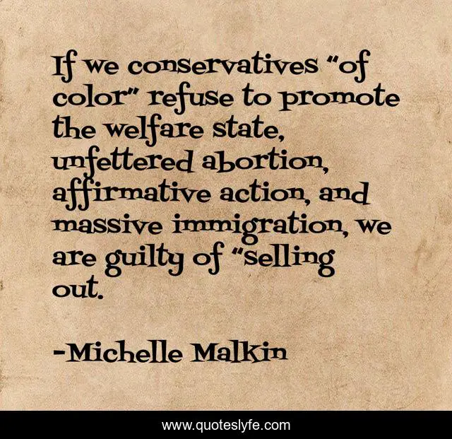 This page presents the quote "If we conservatives “of color” refuse to promote the welfare state, unfettered abortion, affirmative action, and massive immigration, we are guilty of “selling out.". Author of this quote is Michelle Malkin. This quote is about conservative, race, conservatism, conservatives, politics, beliefs,.
