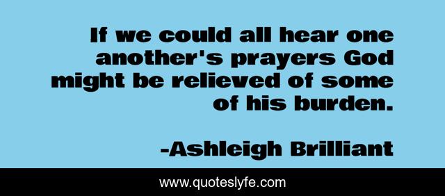 This page presents the quote "If we could all hear one another's prayers God might be relieved of some of his burden.". Author of this quote is Ashleigh Brilliant. This quote is about helping, people,.