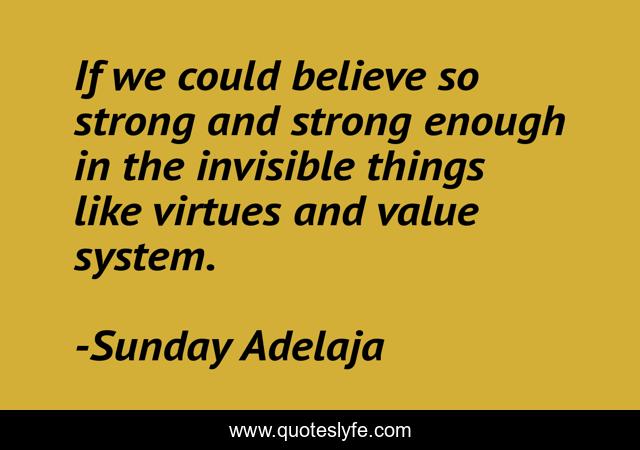 This page presents the quote "If we could believe so strong and strong enough in the invisible things like virtues and value system.". Author of this quote is Sunday Adelaja. This quote is about invisible-things, virtues, value-system, values, virtue, believe, beliefs,.