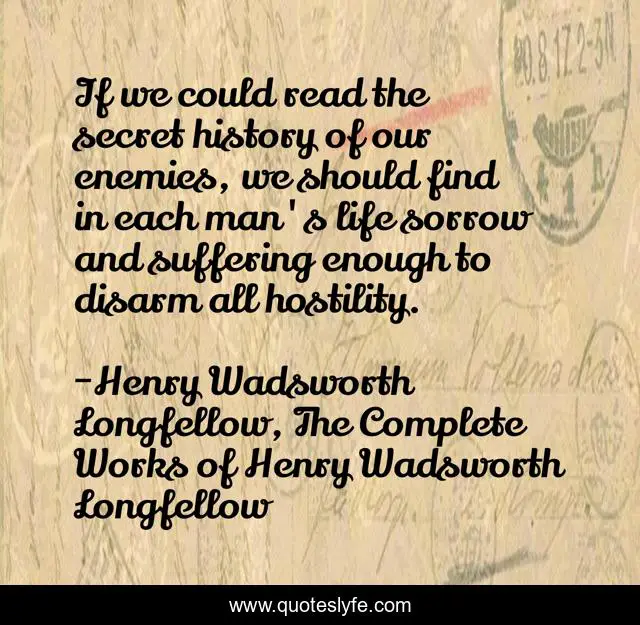 This page presents the quote "If we could read the secret history of our enemies, we should find in each man's life sorrow and suffering enough to disarm all hostility.". Author of this quote is Henry Wadsworth Longfellow, The Complete Works of Henry Wadsworth Longfellow. .