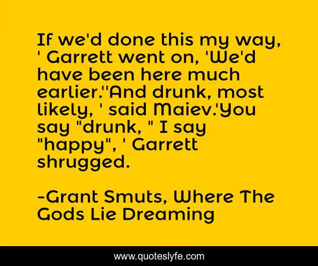 This page presents the quote "If we'd done this my way, ' Garrett went on, 'We'd have been here much earlier.''And drunk, most likely, ' said Maiev.'You say "drunk, " I say "happy", ' Garrett shrugged.". Author of this quote is Grant Smuts, Where The Gods Lie Dreaming. This quote is about drinking, humor,.