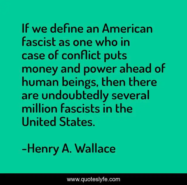 This page presents the quote "If we define an American fascist as one who in case of conflict puts money and power ahead of human beings, then there are undoubtedly several million fascists in the United States.". Author of this quote is Henry A. Wallace. This quote is about politics, money, greed, power, fascism,.