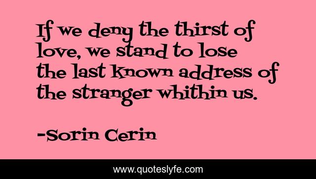 This page presents the quote "If we deny the thirst of love, we stand to lose the last known address of the stranger whithin us.". Author of this quote is Sorin Cerin. .