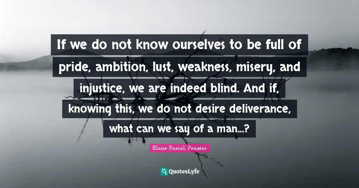 This page presents the quote "If we do not know ourselves to be full of pride, ambition, lust, weakness, misery, and injustice, we are indeed blind. And if, knowing this, we do not desire deliverance, what can we say of a man...?". Author of this quote is Blaise Pascal, Pensées. This quote is about blind, knowing, weakness, ambition, deliverance, lust, injustice, misery, pride,.
