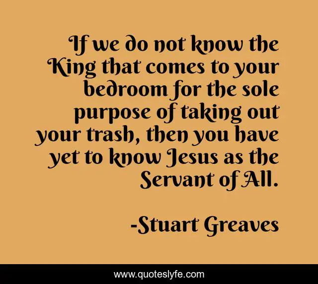 This page presents the quote "If we do not know the King that comes to your bedroom for the sole purpose of taking out your trash, then you have yet to know Jesus as the Servant of All.". Author of this quote is Stuart Greaves. This quote is about servant, king, jesus, god,.