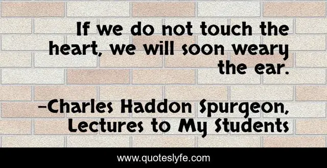 This page presents the quote "If we do not touch the heart, we will soon weary the ear.". Author of this quote is Charles Haddon Spurgeon, Lectures to My Students. This quote is about emotion, motivation, leadership, rhetoric,.