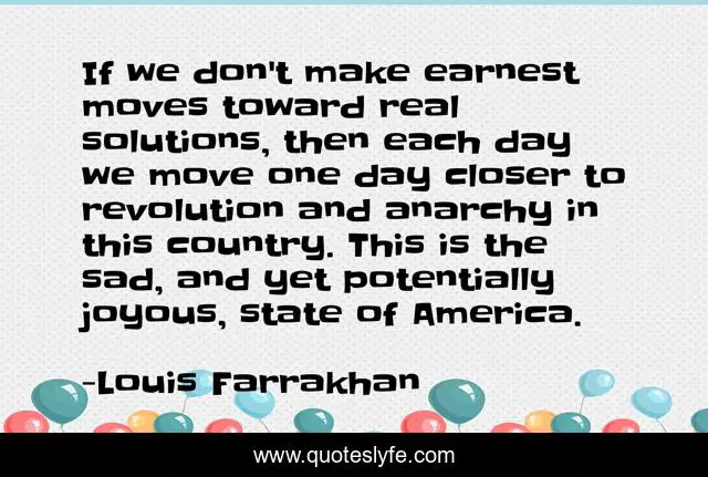 This page presents the quote "If we don't make earnest moves toward real solutions, then each day we move one day closer to revolution and anarchy in this country. This is the sad, and yet potentially joyous, state of America.". Author of this quote is Louis Farrakhan. This quote is about revolution, anarchy,.