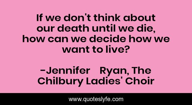 This page presents the quote "If we don't think about our death until we die, how can we decide how we want to live?". Author of this quote is Jennifer Ryan, The Chilbury Ladies' Choir. This quote is about death, ww2, women-s-rights, life-lessons, death-and-dying, women,.