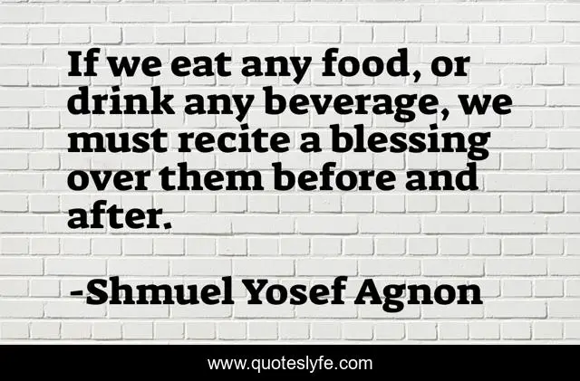 This page presents the quote "If we eat any food, or drink any beverage, we must recite a blessing over them before and after.". Author of this quote is Shmuel Yosef Agnon. This quote is about blessing, eat, drink,.