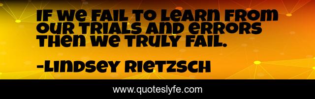 This page presents the quote "If we fail to learn from our trials and errors then we truly fail.". Author of this quote is Lindsey Rietzsch. This quote is about learning-lessons, learning-from-mistakes, inspirational, failure, learning, enthusiasm, philosophy-of-life, motivational-speaker,.
