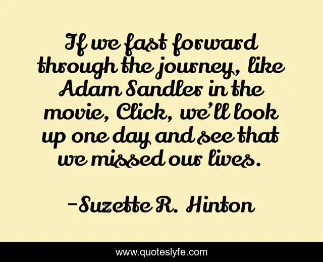 This page presents the quote "If we fast forward through the journey, like Adam Sandler in the movie, Click, we’ll look up one day and see that we missed our lives.". Author of this quote is Suzette R. Hinton. .
