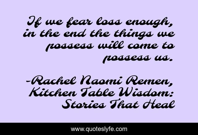 This page presents the quote "If we fear loss enough, in the end the things we possess will come to possess us.". Author of this quote is Rachel Naomi Remen, Kitchen Table Wisdom: Stories That Heal. This quote is about possession, loss, possessions, things, fear, possess,.
