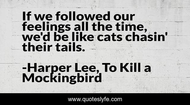This page presents the quote "If we followed our feelings all the time, we'd be like cats chasin' their tails.". Author of this quote is Harper Lee, To Kill a Mockingbird. This quote is about life, death, love, inspirational, people, justice, quote, book, hope,.