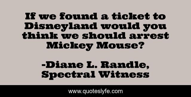 This page presents the quote "If we found a ticket to Disneyland would you think we should arrest Mickey Mouse?". Author of this quote is Diane L. Randle, Spectral Witness. This quote is about ghost, drowning, murder, lost-love, paranormal, crime, bloodlines, blood, thriller,.