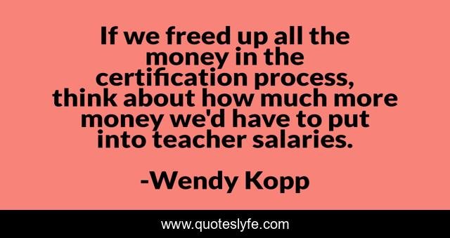 This page presents the quote "If we freed up all the money in the certification process, think about how much more money we'd have to put into teacher salaries.". Author of this quote is Wendy Kopp. This quote is about process, money, think,.