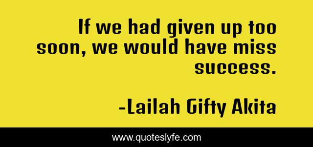 This page presents the quote "If we had given up too soon, we would have miss success.". Author of this quote is Lailah Gifty Akita. This quote is about enthusiasm, inspirational, success, never-give-up,.