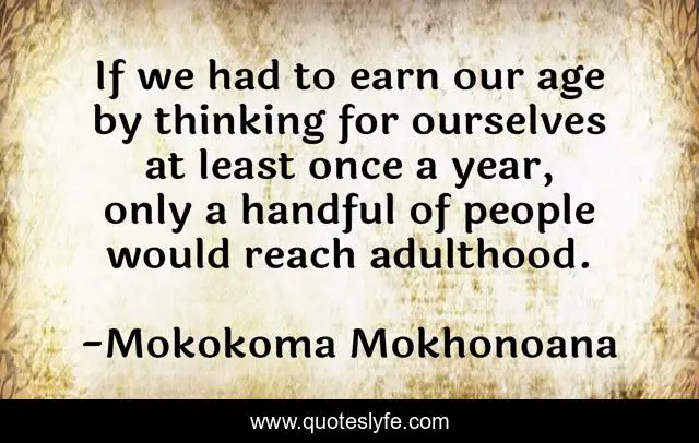 "Mokokoma Mokhonoana Quotes." Quoteslyfe.com, 2025. Mon. 08 Dec. 2025. <https://www.quoteslyfe.com/quote/If-we-had-to-earn-our-age-56294>.