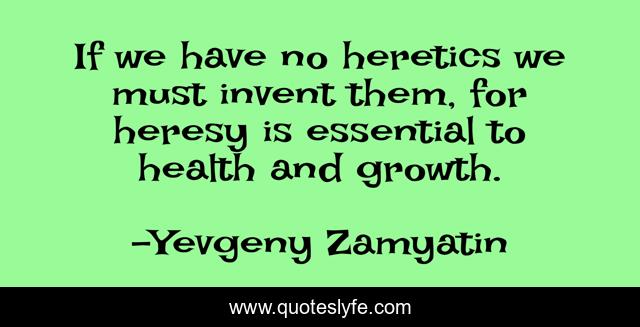 This page presents the quote "If we have no heretics we must invent them, for heresy is essential to health and growth.". Author of this quote is Yevgeny Zamyatin. This quote is about heresy, heretics, literature, art,.