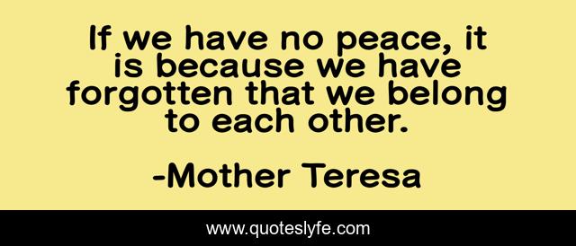 This page presents the quote "If we have no peace, it is because we have forgotten that we belong to each other.". Author of this quote is Mother Teresa. This quote is about sharing, love, compassion, connecting, inspirational, enthusiasm, humanity, affection,.