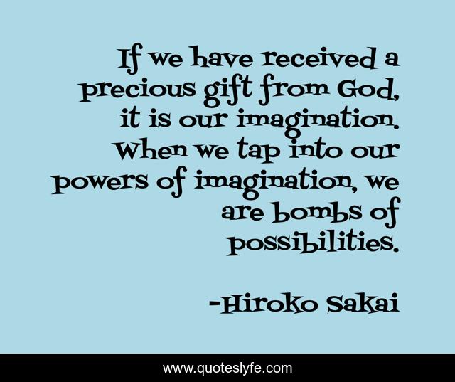 This page presents the quote "If we have received a precious gift from God, it is our imagination. When we tap into our powers of imagination, we are bombs of possibilities.". Author of this quote is Hiroko Sakai. This quote is about god, art, gift, power-of-imagination, imagination,.
