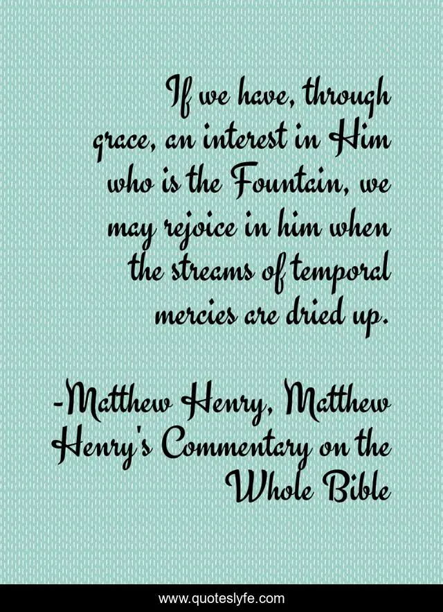 This page presents the quote "If we have, through grace, an interest in Him who is the Fountain, we may rejoice in him when the streams of temporal mercies are dried up.". Author of this quote is Matthew Henry, Matthew Henry's Commentary on the Whole Bible. This quote is about mercy, supremacy-of-christ, the-creator, god, sufficiency, the-source, trials, fullness, affliction,.