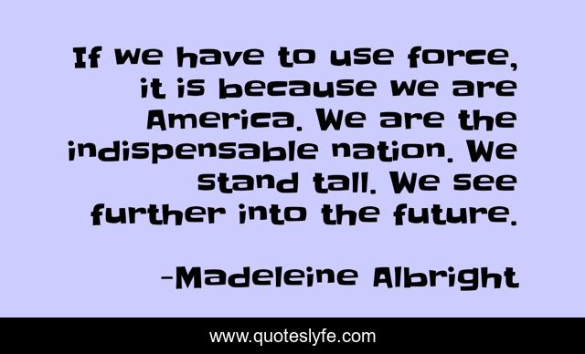 This page presents the quote "If we have to use force, it is because we are America. We are the indispensable nation. We stand tall. We see further into the future.". Author of this quote is Madeleine Albright. This quote is about see, america, stand,.