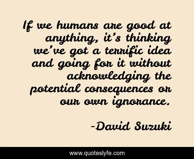This page presents the quote "If we humans are good at anything, it’s thinking we’ve got a terrific idea and going for it without acknowledging the potential consequences or our own ignorance.". Author of this quote is David Suzuki. .