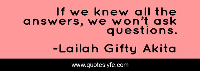 This page presents the quote "If we knew all the answers, we won’t ask questions.". Author of this quote is Lailah Gifty Akita. This quote is about search, seeking, answers-to-prayer, question, wisdom-of-lailah-gifty-akita, inspirational, enthusiasm,.