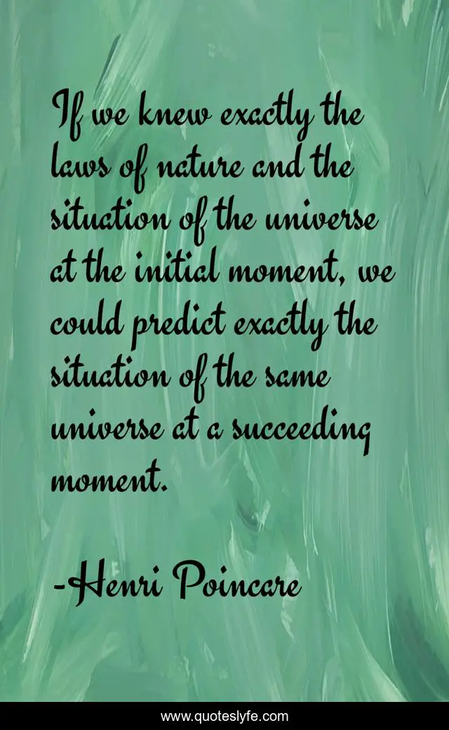 This page presents the quote "If we knew exactly the laws of nature and the situation of the universe at the initial moment, we could predict exactly the situation of the same universe at a succeeding moment.". Author of this quote is Henri Poincare. This quote is about universe, moment, situation,.