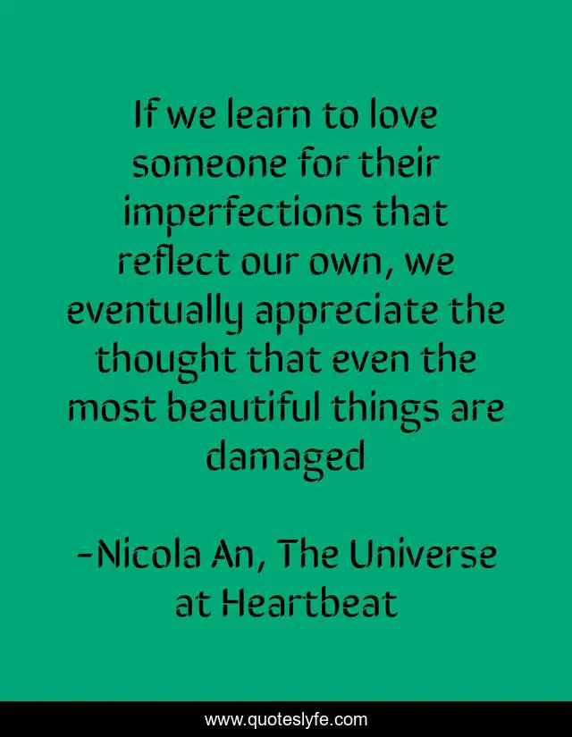This page presents the quote "If we learn to love someone for their imperfections that reflect our own, we eventually appreciate the thought that even the most beautiful things are damaged". Author of this quote is Nicola An, The Universe at Heartbeat. This quote is about beautiful, spiritual, love, mirror-of-my-soul, people, the-universe-at-heartbeat, true-love, poem, flaws,.