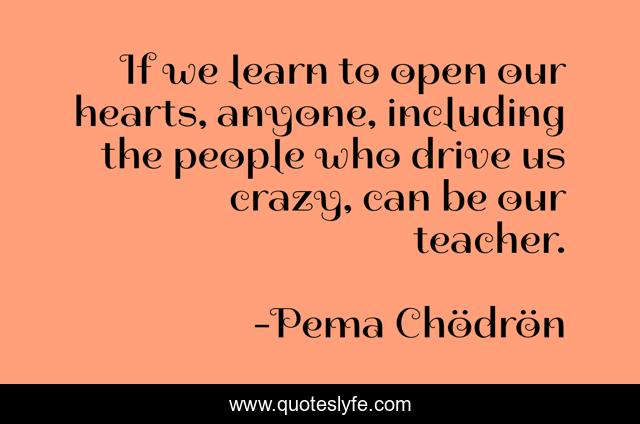 This page presents the quote "If we learn to open our hearts, anyone, including the people who drive us crazy, can be our teacher.". Author of this quote is Pema Chödrön. This quote is about buddhism, shambhala,.