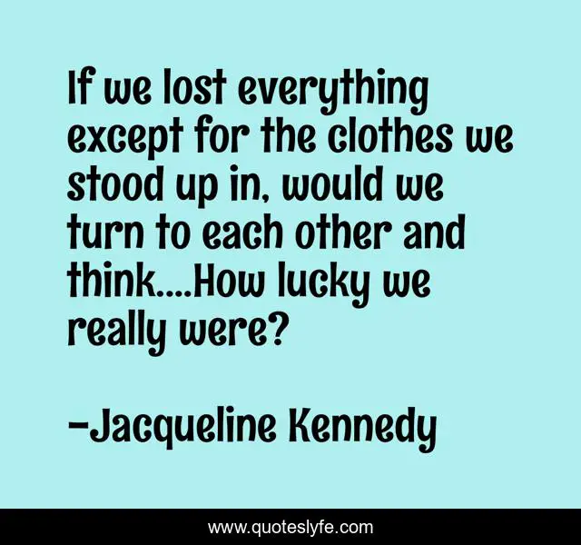 This page presents the quote "If we lost everything except for the clothes we stood up in, would we turn to each other and think....How lucky we really were?". Author of this quote is Jacqueline Kennedy. This quote is about appreciation, insight, profound-thought,.