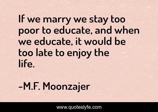 This page presents the quote "If we marry we stay too poor to educate, and when we educate, it would be too late to enjoy the life.". Author of this quote is M.F. Moonzajer. This quote is about enjoy, poor, educate, life, marry,.