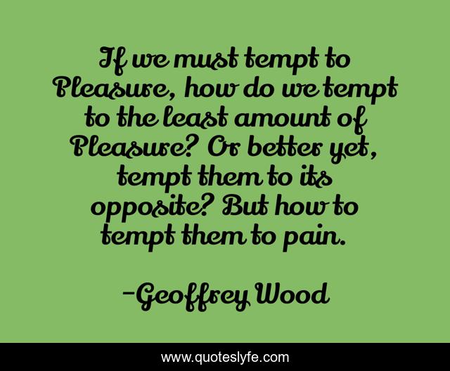 This page presents the quote "If we must tempt to Pleasure, how do we tempt to the least amount of Pleasure? Or better yet, tempt them to its opposite? But how to tempt them to pain.". Author of this quote is Geoffrey Wood. This quote is about pain, christianity, religion, grimrack, pleasure, addiction, christian-fiction,.