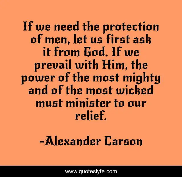 This page presents the quote "If we need the protection of men, let us first ask it from God. If we prevail with Him, the power of the most mighty and of the most wicked must minister to our relief.". Author of this quote is Alexander Carson. This quote is about favor, leaders, sovereignty-of-god,.