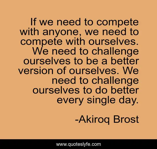 This page presents the quote "If we need to compete with anyone, we need to compete with ourselves. We need to challenge ourselves to be a better version of ourselves. We need to challenge ourselves to do better every single day.". Author of this quote is Akiroq Brost. This quote is about challenge, motivation, competition, inspiration,.