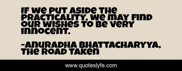 This page presents the quote "If we put aside the practicality, we may find our wishes to be very innocent.". Author of this quote is Anuradha Bhattacharyya, The Road Taken. This quote is about facts-of-life, life, wishes, wishing, innocence,.